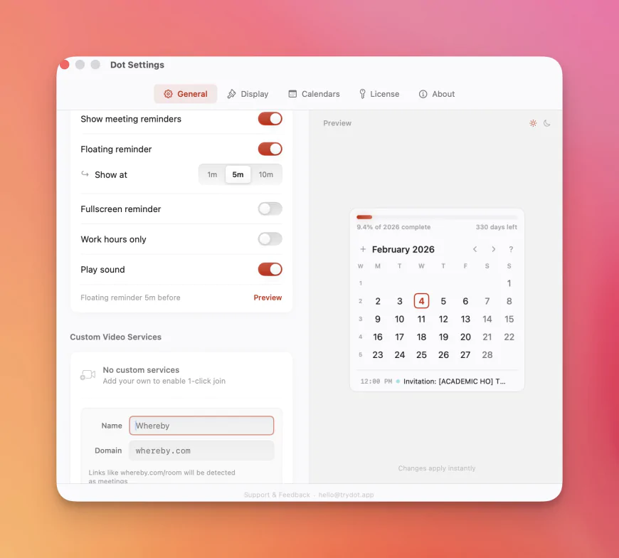 Tóm lại, Dot là một ứng dụng lịch tối giản nhưng cực kỳ thực dụng: giúp bạn xem lịch nhanh ngay trên menu bar, nhắc họp thông minh và tham gia meeting trong một cú nhấp. Với dân văn phòng, freelancer, remote worker hoặc bất kỳ ai đang sống theo lịch, đây là một công cụ nhỏ nhưng đem lại hiệu quả rất lớn.